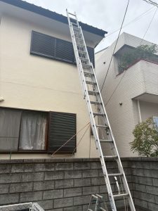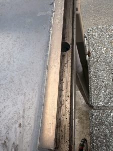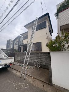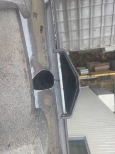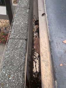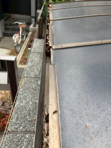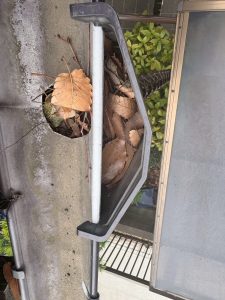 雨樋の詰まりを放置すると雨水が外壁を伝って流れ、雨漏りや外壁劣化につながる可能性があるため、早期の雨樋清掃をご提案いたしました。